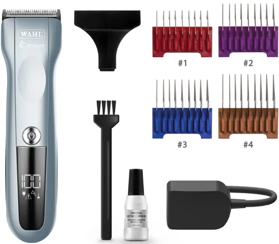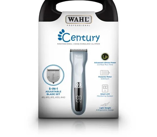 Professional Cord/Cordless Animal Clipper! Wahl's Century cordless clipper provides you with a powerful and fast cutting experience. The professional rotary motor is extremely quiet which is great for noise sensitive animals. It also features 6,000rpm and constant speed control giving you superior performance. The Lithium-Ion battery gives you 2.5 hours of cordless run time from 60 minutes quick charge. This clipper also comes with the 5-in-1 high-precision blade that gives you 5 adjustable cutting lengths: (#9, #10, #15, #30, #40). It is chrome-plated, rust resistant, snap on/off for easy cleaning. The smart LCD monitoring screen displays the run time and includes sound notification for low power and maintenance (cleaning, oil, malfunction). This clipper is ideal for body clipping and trimming dogs, cats, horses, and livestock. Kit Includes: Century Clipper, professional snap on/off blade set, storage/travel case, four Stainless Steel Guide Combs (6mm, 10mm, 13mm, 16mm), cleaning brush, blade oil, transformer. Make your clipper last: Help maintain the longevity of your clipper by using the cleaning brush provided and regularly oiling the blades with Wahl Clipper Oil. Additionally, ensure the animal is clean before clipping as this will give you a better cutting experience and assist with the durability of the blades. Additional Information • Coat Type: Ideal for dogs, cats, horses, and livestock. • Cleaning Type: Snap on/off blade for easy cleaning. • Grooming Type: Clippers & Blades • Brand: Wahl • Benefits o Professional Motor Powerful & quiet rotary motor featuring constant speed control and 6,000rpm o Lithium-Ion Cordless Clipper High performance battery gives you up to 2.5hours run time off a full charge with 60 minutes quick charge. o LCD Screen LCD displays with runtime and sound notification for low power and maintenance (cleaning, oil, malfunction).