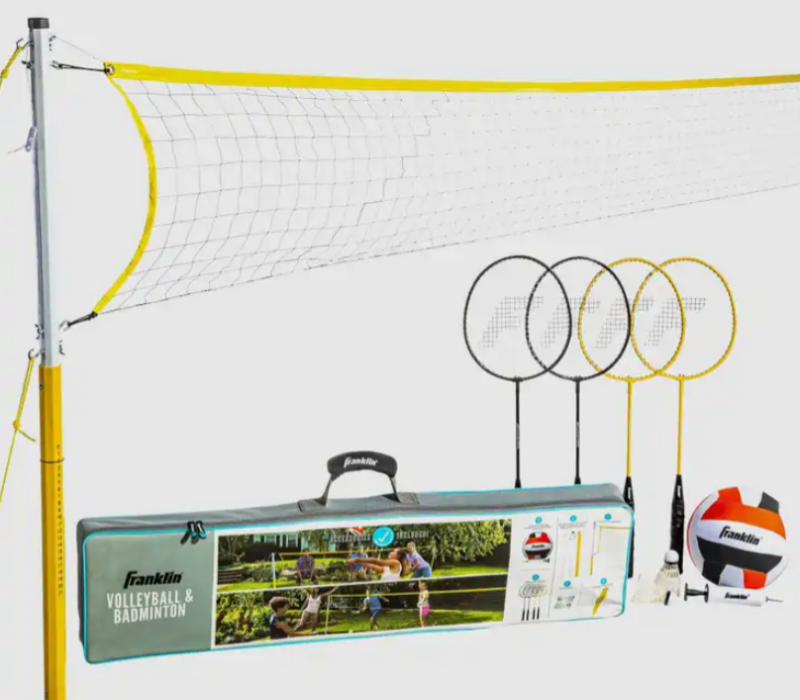 The Franklin Sports Volleyball/Badminton set is a classic outdoor game that will bring hours of fun for all ages. The set includes all you need for a day of fun: (1) Combo Volleyball/Badminton pole set and net, (4) steel badminton rackets, (2) nylon birdies, (1) polyester volleyball. The Volleyball/Badminton combo set is easily transportable to your next picnic, BBQ or party and is sure to be a hit. Volleyball/Badminton is a timeless classic yard game that can be enjoyed by all ages...bring this set to your next gathering today!