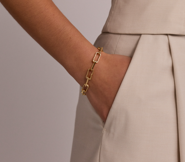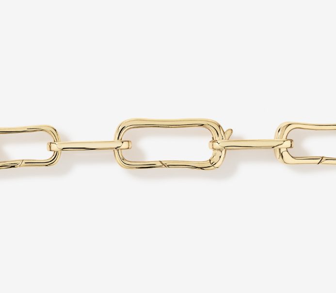 Crafted in 925 sterling silver with a generous layer of 18kt yellow gold vermeil, this 20.5cm link bracelet features a modern paperclip-inspired design with alternating closed and clasp-style links. A larger hidden-lever link allows for easy fastening, while the bracelet is designed to carry and stack Pendant Bar pendants for a personalised charm look. Maximum of two pendants per link. Extension links can be purchased separately to achieve a customised length.