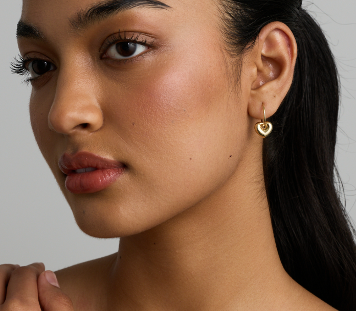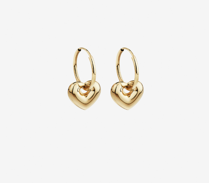 Flexible 12mm hinge-less sleeper hoops in 10 karat yellow gold with removable polished puff hearts. A versatile design that can be worn with or without the charm for effortless styling.