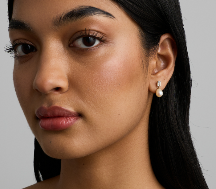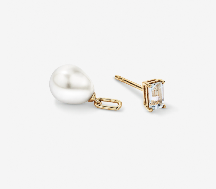 5X3mm Emerald-cut aquamarine studs paired with removable 6.5mm cultured freshwater pearl drops, set in high-polished 10 karat yellow gold. These multi-wear earrings offer versatility—wear the aquamarine studs alone or rotate them east-west for a modern look. A portion of each pearl piece supports charities dedicated to empowering women, making this design as meaningful as it is beautiful. Please note, the beautiful blue hues of our natural aquamarine gemstone pieces may show slight variations from the product imagery.