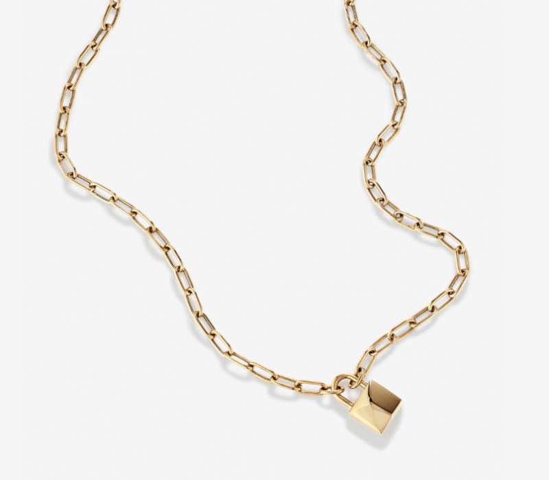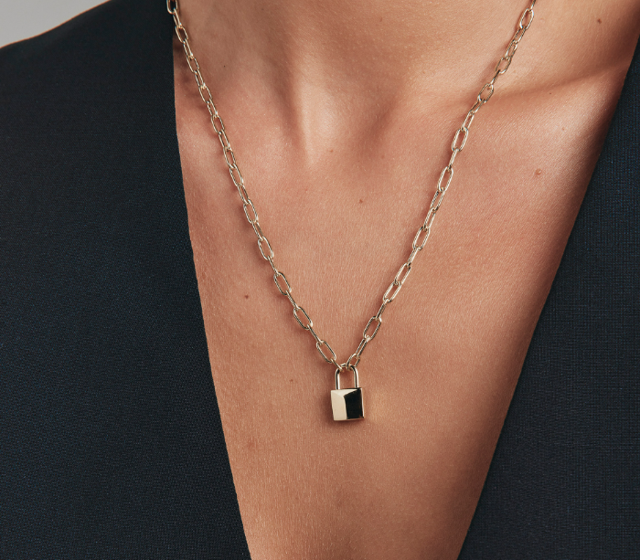 Elevate your look with this 10 karat yellow gold necklace, featuring our exclusive Signature Lock pendant. Crafted with a functional padlock pendant, this modern piece features a paperclip chain measuring 45cm with a 5cm extender. Secured with a lobster clasp for added security and style.