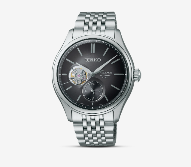 Blending artistry with a mastery of mechanical watchmaking, the Seiko Presage Classic Automatic Watch is a showcase of elegance and tradition. With a stainless steel case and bracelet, the black dial is inspired by Japanese silk fabric that reflects ambient light. With an automatic movement powered by the wearer, it features an open-heart sub-dial that showcases the intricacy of the movement.