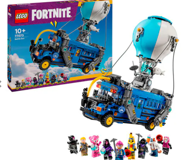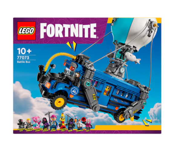 Ignite imaginations with the LEGO® Fortnite® Battle Bus (77073) video game toy for fans aged 10 and up. Based on the exciting video game, the building set lets gamers create a cool Fortnite vehicle. Fans journey into the exciting LEGO Fortnite world as they build the bus, which has rolling wheels and a removable roof, and the instantly recognizable hot-air balloon. But that's just the start! Once the bus is complete, they'll delight in discovering iconic accessories such as Slurp Juice, a Grappler, Pickaxes and Slap Juice, as well as 9 minifigures of iconic Fortnite outfits. Bringing the adventure to life, these can be seated inside the bus to fuel creative role play. Once kids have finished playing with the collectible toy, it becomes an awesome piece of LEGO decor that they can display proudly in their bedrooms or games rooms. It also makes a thoughtful gift for gamers and LEGO Fortnite fans, who will spend hours reaching new levels of creativity with this set.