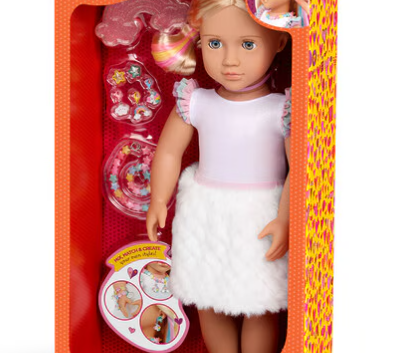45cm Doll & Jewelry Set: Mix, match, and create dazzling styles with Our Generation 45cm doll Mariana! Make Your Own Jewelry: Kids can clip all 3 jewelry charms to the necklace and bracelets to transform each look and showcase their personal style! Detailed Features: Mariana has lifelike blue eyes that open and close, light-blonde hair with peekaboo highlights, and pierced ears to wear her earrings! Easy to Play: She has a soft, huggable body with a movable head, arms, and legs so kids can easily change her outfit during dress-up. Includes: 45cm doll, a pair of earrings, a rainbow-themed necklace with 2 matching bracelets, 3 jewelry charms, a pink jewelry box, a cute leotard, a faux-fur skirt, and shoes with rainbow laces. Mix & Match: Clothing has easy-open closures to quickly put on and remove as kids explore imagination and self-expression. Compatible with most 45cm dolls, doll clothes, and doll accessories. Recommended Age: Our Generation dolls make a great gift for kids ages 3 years old and up (small parts), encouraging them to create their own unique stories.