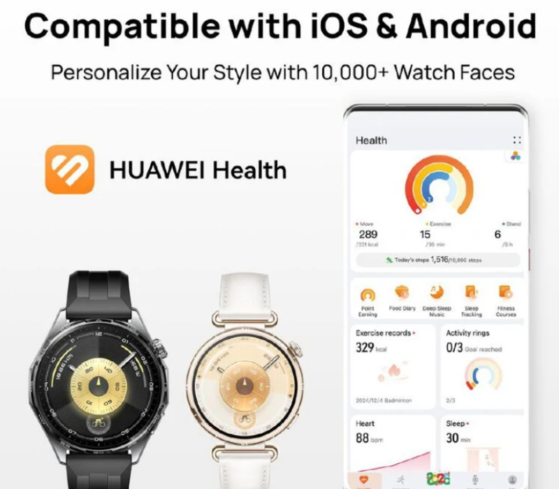 Meet the HUAWEI WATCH GT 6 - where classic design meets performance. Featuring a 1.47" and 1.32" AMOLED display with 3000 nits peak brightness. The raised timing bezel enhances the watch's face with a sleek look that commands attention, while the new pivoting loop lugs (41 mm) provide a refined, ergonomic design for enhanced comfort and a seamless fit. With up to 21-day battery life (46mm) and 14-day battery life (41mm), the WATCH GT 6 Series is seamlessly compatible with Android & iOS, making it your ultimate partner for performance, protection, and everyday excellence. For athletes and explorers, the GT 6 offers 100+ sports modes. Cyclists get an all-new experience with Cycling Virtual Power, which measures real-time and average power output, helping you train smarter and adjust intensity like a pro. Precision is further elevated by the upgraded HUAWEI Sunflower Positioning System, delivering enhanced GNSS accuracy for running and cycling. Stay safe with Fall Detection and Emergency SOS assistance, while advanced health and emotional wellbeing monitoring provides deeper insights into your heart, sleep, stress, and emotional states.
