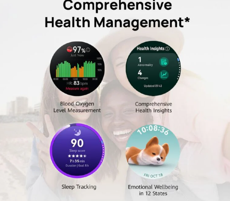 - Comprehensive Health Management Track heart rate, sleep, HRV, SpO¿, and more with precision. The upgraded emotional well-being function also detects up to 12 emotional states, giving you deeper insights into both body and mind