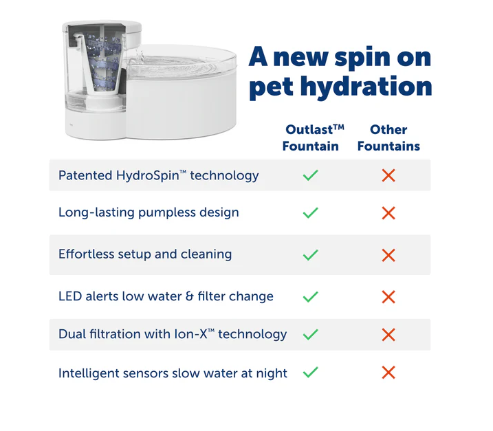 MEET THE PETSAFE OUTLAST 3.7l PUMPLESS DOG FOUNTAIN- OUR PATENTED HYDROSPIN TECHNOLOGYKEEPS WATER FLOWING. THE FILTER SYSTEM KEEPS THE WATER TASTING GREAT AND ALWAYS LOOKING FRESH. GIVES YOUR DOG A HEALTHIER HYDRATION EXPERIENCE