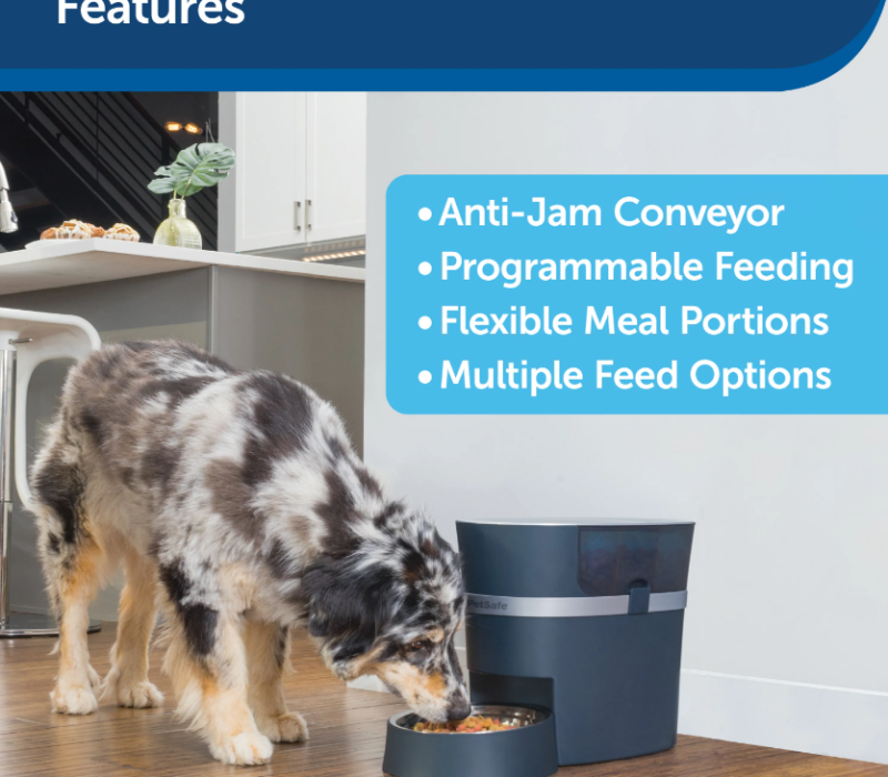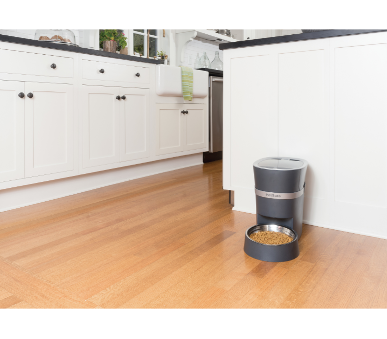 Bring peace of mind to meal time with the PetSafe® Smart Feed Automatic Pet Feeder. Designed by pet parents, you can schedule, monitor and adjust your pet’s feeding schedule remotely with the user-friendly smartphone app. Download the free app to your phone or mobile device, connect the feeder to your home’s Wi-Fi and enjoy convenient meal scheduling from anywhere. The feeder holds 24 cups (5,678 ml) of dry or semi-moist food. The unique design of the Smart Feed’s food conveyor dispenses most shapes and sizes of dry and semi-moist food while helping to prevent jams. Meals can be scheduled for up to 12 times daily in sizes from 1/8 cup (29 ml) to 4 cups (946 ml) per meal. The optional Slow Feed setting dispenses meals in small amounts over 15 minutes for pets who tend to eat too quickly. The Feed Now option lets you serve a meal on demand any time from the app or with the push of a pet-proof button on the feeder. The included stainless steel bowl with a removable holder prevents your pet from tipping or moving the bowl. These components and the upper compartment where food is added are all dishwasher safe, top rack only. The automatic pet feeder includes an AC power adapter and has a backup battery option using 4 D batteries (not included). To connect your PetSafe™ Smart Feed Automatic Pet Feeder to your smartphone app, a 2.4GHz (802.11b/g/n) wireless router is required. Devices that work with the mobile app are iPhones or iPods with iOS 9.0 or later and compatible Android smartphones version 6.0 or later. One feeder can be controlled from multiple family members’ smartphones. Multiple feeders can also be controlled from one smartphone.