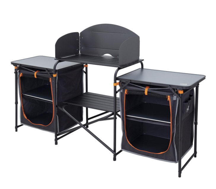 A portable kitchen unit that is perfect for storing and preparing all your camping meals. One alloy slat bench-top with windshield for stove cooking and two MDF benches for preparation space.